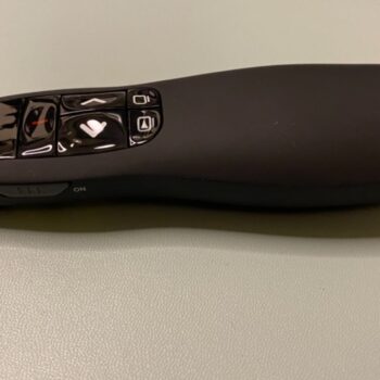 Comfortable to hold, simple to use, and has a bright red laser for highlighting on a projector screen.
