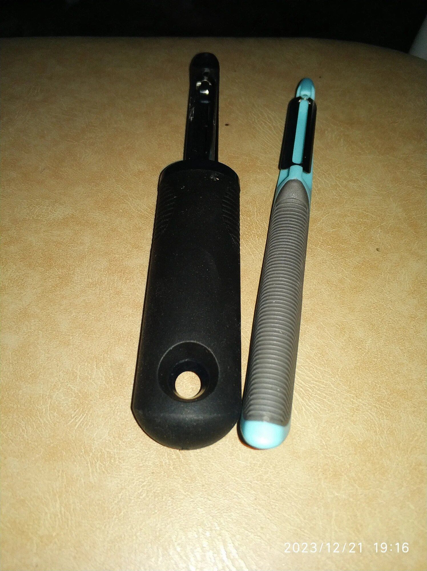 The handle is made of a comfortable rubber coating, non-slip when wet, very comfortable for a large palm Clean vegetables fine, blades are very sharp, handle It is much wider than ordinary potato peppers, which makes the cleaning process easier