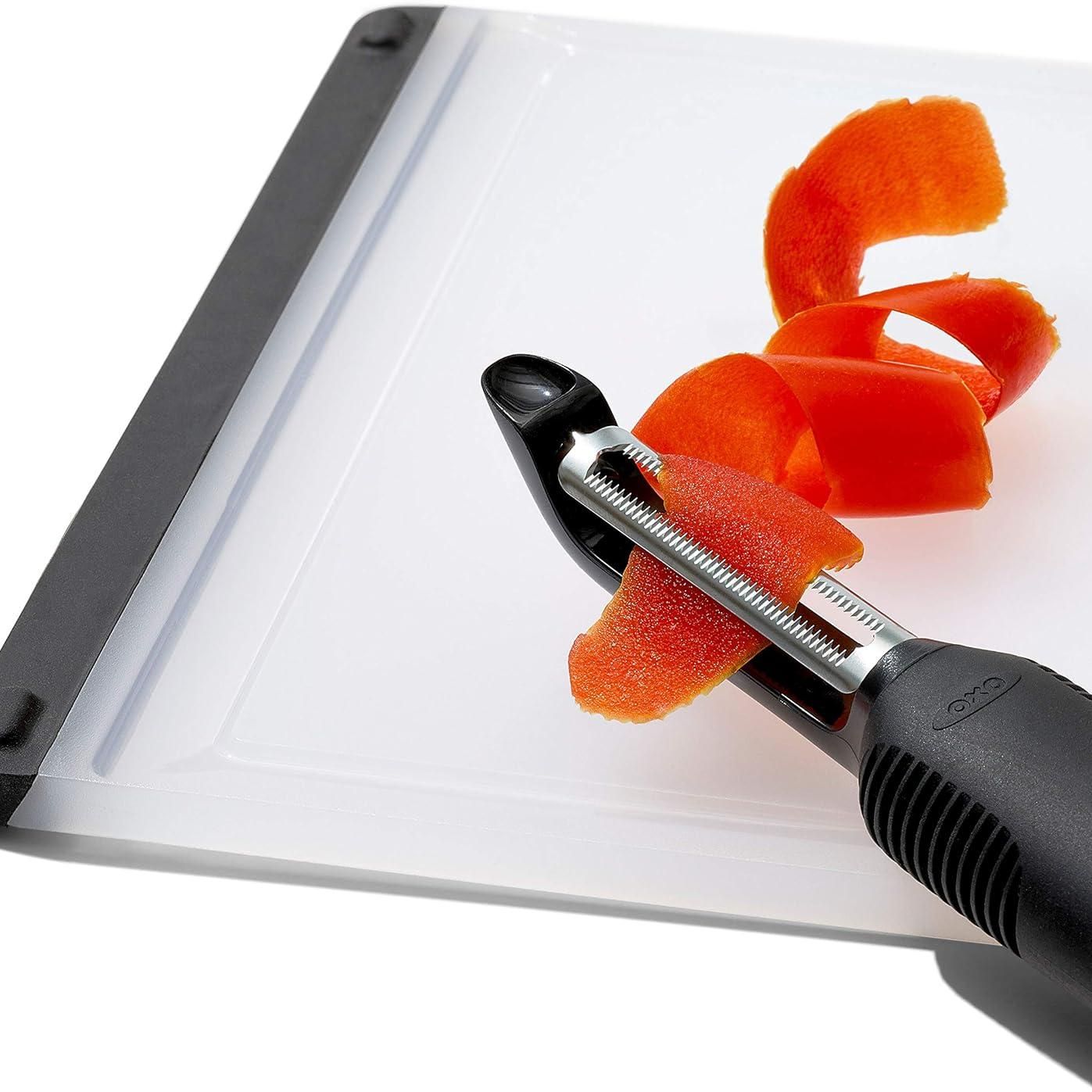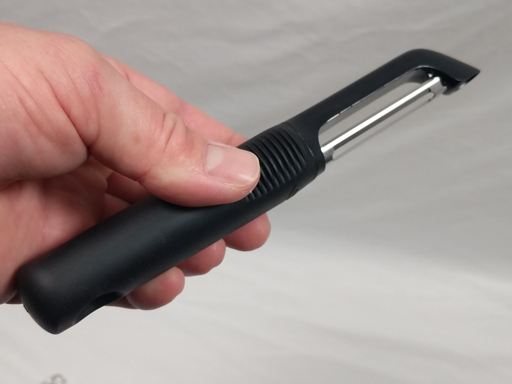 This peeler is fantastic for carrots and other veggies that you peel in long strokes. It works both up and down, which really speeds up the process. The grip is comfortable, but the thick handle doesn't fit in my utensils drawer and it's a bit tricky to fit in the dishwasher.